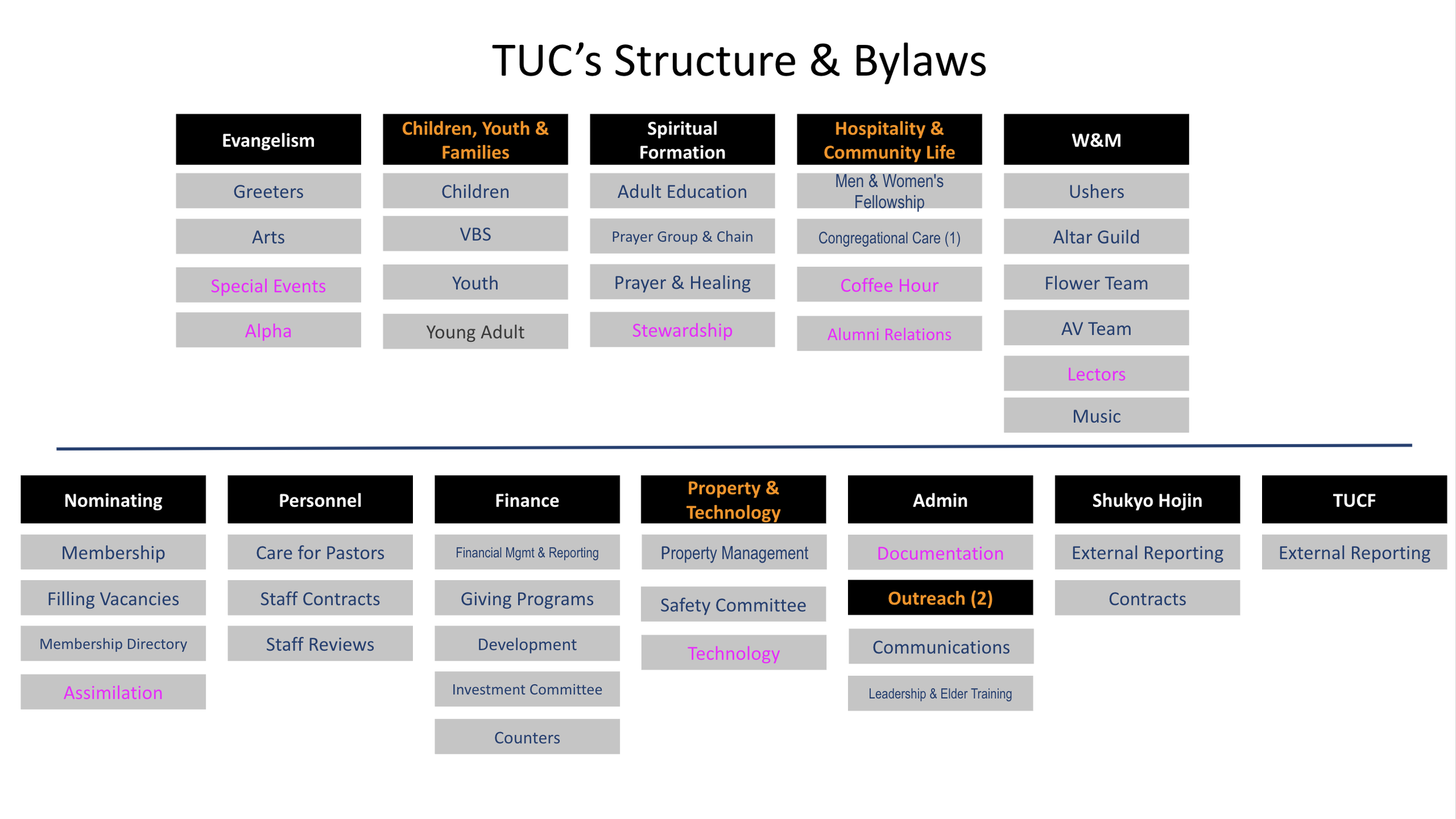 Tokyo Union Church is an independent union church so governing documents are extremely important. It’s been over a decade since our by-laws were last updated in 2011. Although a heroic effort was put in by Jim Anderson, Karl K, Anita Gesling and Jody Fuller to update the By-Laws in 2013-14, they did not reach the finish line of Council approval.